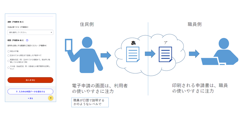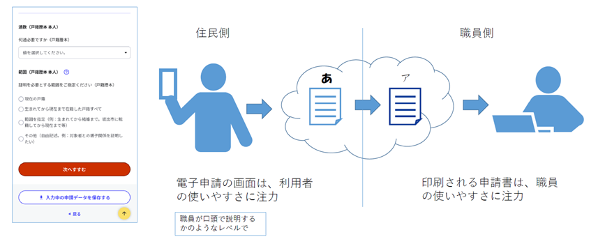 この仕組みは、ぴったりサービスの機能を活用し、ノーコードで構築した。住民向けの画面では、例えば戸籍事項証明の申請であれば「改正原戸籍」のような専門用語は使わず、「生まれてからいつまでの戸籍が必要ですか」といった平易な質問が並ぶ。「目指したのは、窓口で職員が口頭で説明するレベルの分かりやすさです」と畔上氏は強調する。