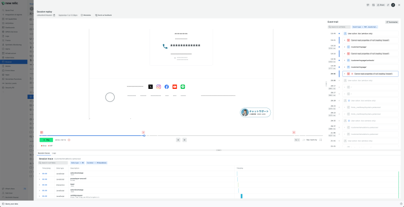 さらに、SREチームではユーザー体験を損なう不具合の原因調査にNew Relicの「Session Replay」を活用している。Session Replayでは、エラーが発生する前後の顧客の画面操作や、API呼び出しなどを詳細に記録・再現できる。エラーが含まれるセッションの「録画」を確認して、顧客が操作目的を達成できたか、画面を閉じ離脱してしまったかを把握できる。これにより、より正確に問題の発生原因を突き止め改善に結びつけることが可能となった。